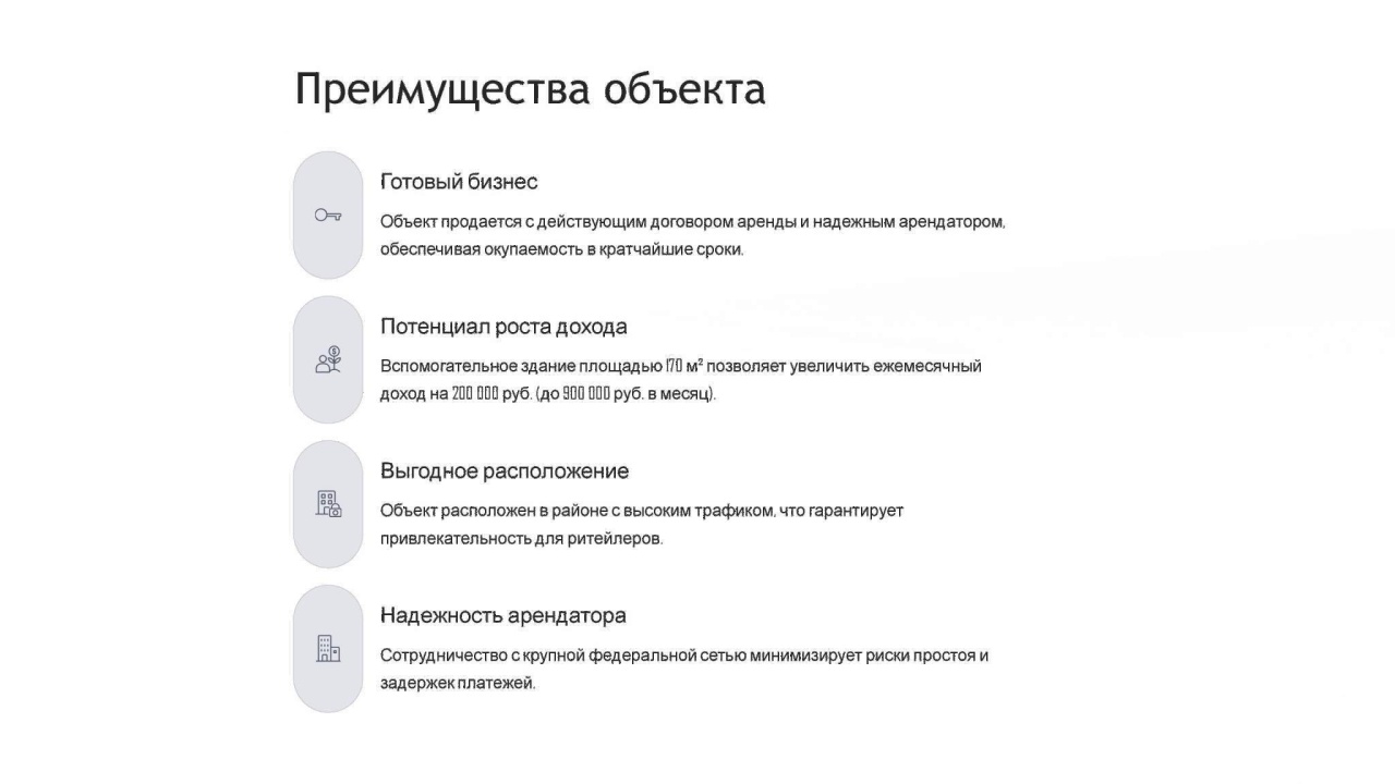 Идеальный актив для инвестора: не просто недвижимость, а работающий бизнес с моментальным денежным потоком от федерального арендатора. Покупая этот объект, вы приобретаете стабильность, защищенность и высокий потенциал роста.